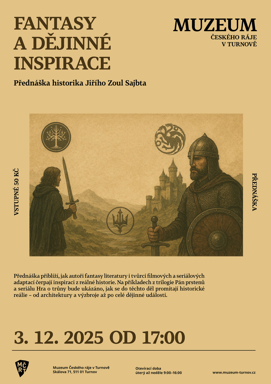Přednáška ukáže, jak autoři fantasy literatury i tvůrci filmových a seriálových adaptací čerpají inspiraci z naší skutečné historie. Na příkladech ze známých děl posledních dvaceti pěti let – filmové trilogie Pán prstenů a seriálu Hra o trůny – si přiblížíme, které prvky jejich světa vycházejí z reálných historických předloh. Společně se podíváme na to, jak se minulost promítá do architektury, zbraní, zbrojí i samotných dějinných událostí těchto ikonických příběhů.