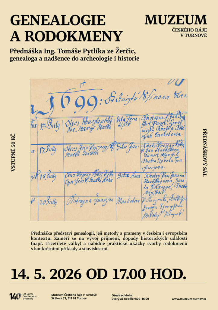Přednáška Ing. Tomáše Pytlíka ze Žerčic, genealoga a nadšence do archeologie i historie Přednáška představí genealogii jako obor, jeho metody i postavení České republiky v evropském kontextu. Jaké jsou hlavní prameny genealoga (matriky, soupisy poddaných, úřední knihy, kroniky, paměti a mapové podklady). Dopady válečných události jako třicetiletá válka a následná populační obnova. Objasníme si vznik a ustálení příjmení. Celý program doplní genealog Tomáš Pytlík praktickými ukázkami z již zpracovaných rodokmenů, nabídne konkrétní příklady metod i zajímavých historických souvislostí.