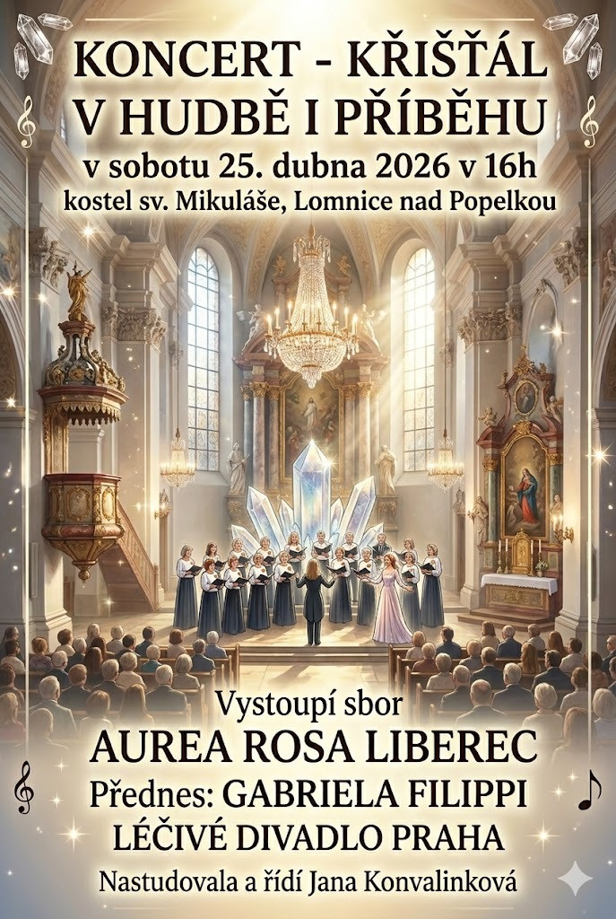 Přijďte zažít okamžik, kdy se křišťálový zvuk sborového zpěvu potká s hloubkou vyprávění. Věříme, že stejně jako se v křišťálu láme světlo do všech barev duhy, i hudba dokáže projasnit naše nitra. Pojďme společně rozeznít a rozzářit tento vzácný prostor i naše srdce.