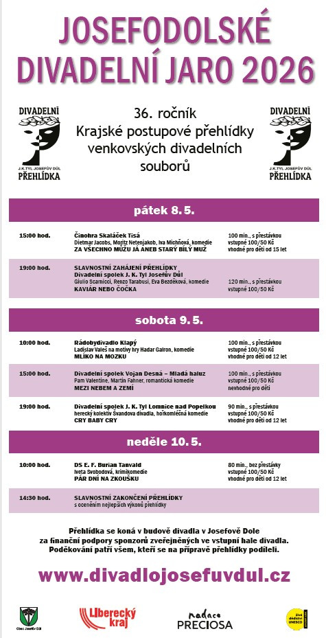V sobotu v 10:00 hod. Rádobydivadlo Klapý uvede Mlíko na mozku, v 15:00 hod. Divadelní spolek Vojan Desná - Mladá haluz Mezi nebem a zemí a v 19:00 Divadelní spolek J. K. Tyl Lomnice nad Popelkou Cry Baby Cry.